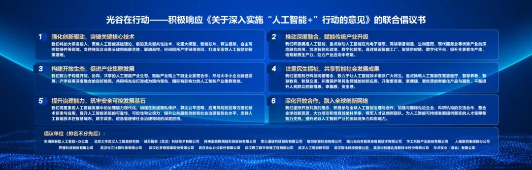 在論壇上,為積極響應國務院《關于深入實施“人工智能+”行動的意見》,東湖高新區(qū)人工智能+辦公室組織光谷的十七家企業(yè)和科研院所發(fā)布了“光谷在行動”聯(lián)合倡議。該倡議的發(fā)布,既是光谷響應國家 “人工智能+”戰(zhàn)略的堅定表態(tài),更彰顯了光谷AI產(chǎn)業(yè)集群引領行業(yè)發(fā)展、助力數(shù)字中國建設的責任與擔當。