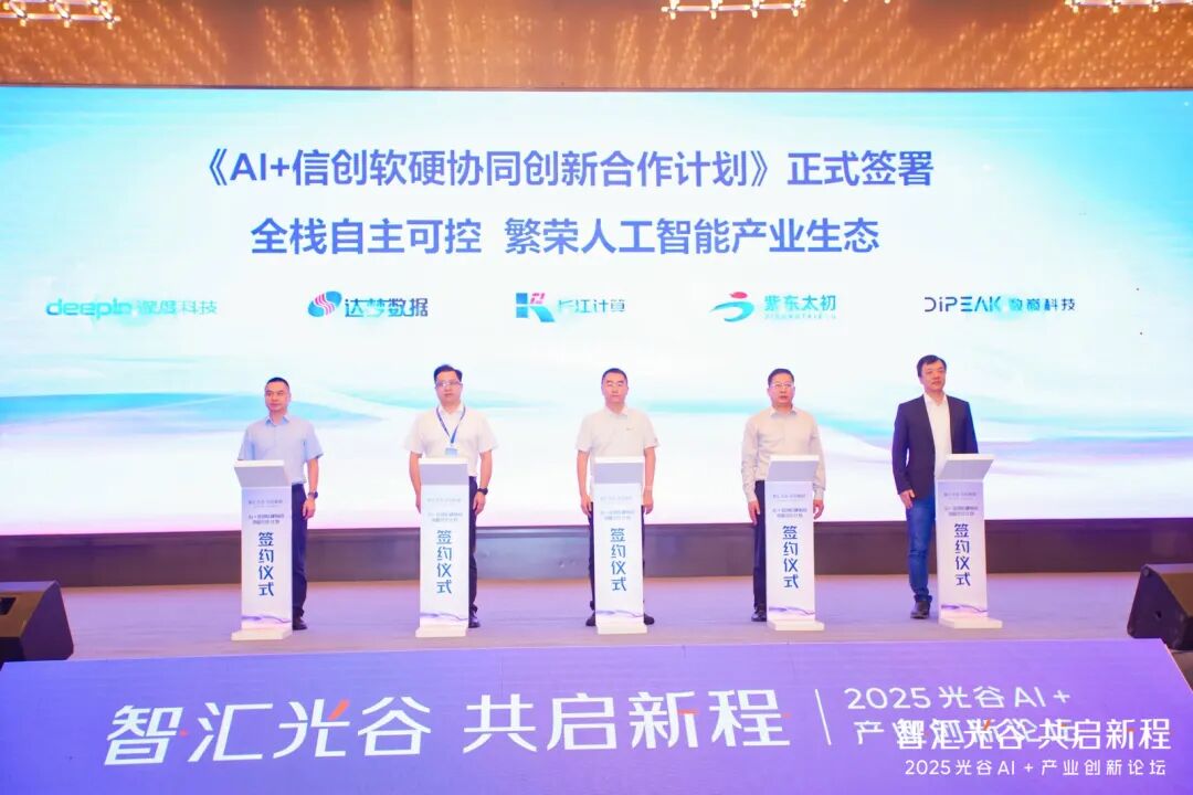 同時,長江計算、紫東太初、達夢數(shù)據(jù)、深度科技、數(shù)巔科技攜手,正式啟動了《AI+信創(chuàng)軟硬協(xié)同創(chuàng)新合作計劃》,旨在整合各方技術、資源與科研優(yōu)勢,聯(lián)合開展AI+信創(chuàng)領域的技術研發(fā)與創(chuàng)新,通過優(yōu)化資源配置、提升利用效率,共同構建國產(chǎn)自主可控的人工智能產(chǎn)業(yè)一體化生態(tài),為光谷乃至全國AI+信創(chuàng)產(chǎn)業(yè)高質量發(fā)展注入?yún)f(xié)同新動能。