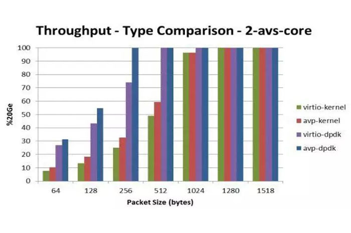 在10Gbps流量下,AVP在256字節(jié)短包時(shí)較vhost-user提高1/3吞吐量,達(dá)到線性吞吐;混合包平均時(shí)延15us,遠(yuǎn)低于vhost-user的30us。