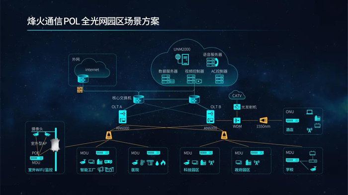 十多年來,隨著寬帶中國(guó)戰(zhàn)略的實(shí)施,國(guó)內(nèi)電信運(yùn)營(yíng)商已普及了FTTH應(yīng)用,PON技術(shù)在家庭寬帶市場(chǎng)取得了巨大的成功,在產(chǎn)品成熟度、產(chǎn)業(yè)鏈、建設(shè)成本等方面已具備顯著的應(yīng)用優(yōu)勢(shì)。在此基礎(chǔ)上,新一代全光網(wǎng)絡(luò)憑借多業(yè)務(wù)能力、綠色節(jié)能、經(jīng)濟(jì)高效、簡(jiǎn)單靈活、安全可靠等特點(diǎn),在更為廣闊的政企市場(chǎng)彰顯出強(qiáng)大的生命力,POL(無源光纖局域網(wǎng))已成為各行業(yè)數(shù)字化轉(zhuǎn)型中園區(qū)基礎(chǔ)網(wǎng)絡(luò)建設(shè)的優(yōu)先選擇。烽火通信深入分析企業(yè)園區(qū)對(duì)網(wǎng)絡(luò)的業(yè)務(wù)需求,借助在運(yùn)營(yíng)商FTTH寬帶網(wǎng)絡(luò)深厚的技術(shù)積累,推出基于AN6000系列OLT平臺(tái)的全新一代POL園區(qū)網(wǎng)絡(luò)解決方案,全面助力企業(yè)提升信息化建設(shè)水平。