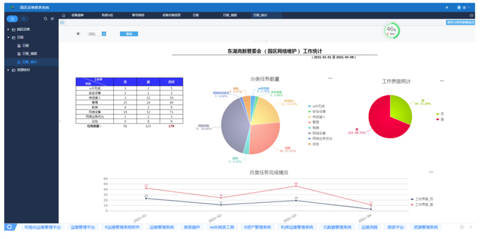 針對運(yùn)維初期存在的數(shù)據(jù)信息更新不及時、版本繁多、數(shù)據(jù)遺漏等問題,團(tuán)隊(duì)自研開發(fā)并試運(yùn)行了一套運(yùn)維報(bào)表管理系統(tǒng),可對整個機(jī)房的設(shè)備狀態(tài)、類型、廠家等信息進(jìn)行統(tǒng)計(jì)、查詢。每日記錄網(wǎng)絡(luò)工作日志后,系統(tǒng)可根據(jù)日志數(shù)據(jù)自動按周、月、季度生成數(shù)據(jù)圖。在使用運(yùn)維系統(tǒng)進(jìn)行統(tǒng)一錄入管理后,整個數(shù)據(jù)臺賬能精準(zhǔn)查詢,還能根據(jù)關(guān)注項(xiàng)目自動輸出圖表,大大緩解了日常記錄、分析類繁瑣工作的壓力,更好地對園區(qū)網(wǎng)絡(luò)進(jìn)行運(yùn)維管理。