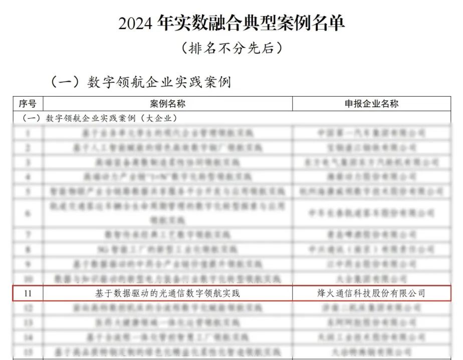 近日,工業(yè)和信息化部公示了2024年實數(shù)融合典型案例名單,烽火通信“基于數(shù)據(jù)驅(qū)動的光通信數(shù)字領(lǐng)航實踐”成功入選“數(shù)字領(lǐng)航”大企業(yè)名單。